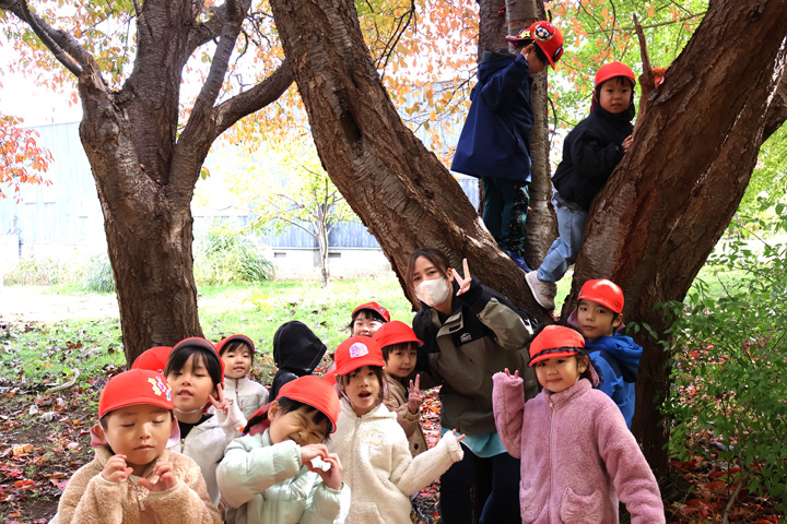 ふかふかの落ち葉の上で、木登りにもチャレンジ。 大人気で行列ができました!