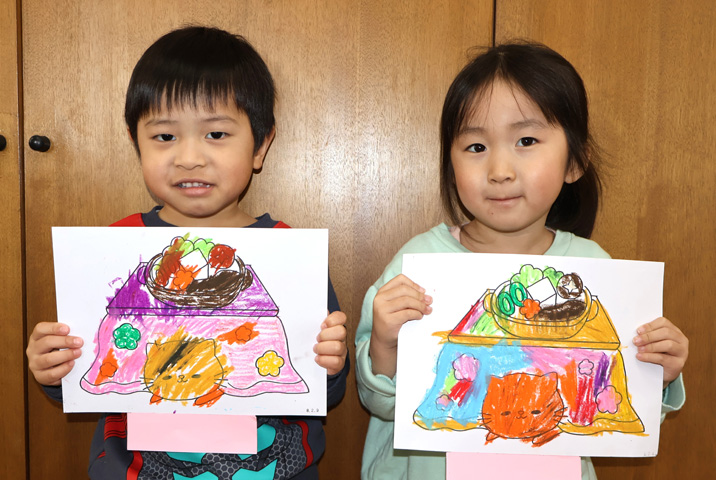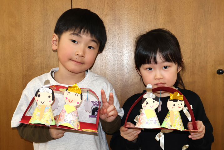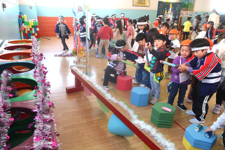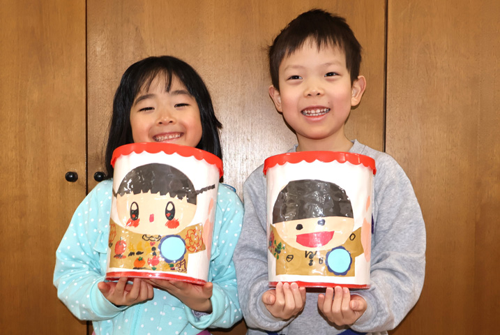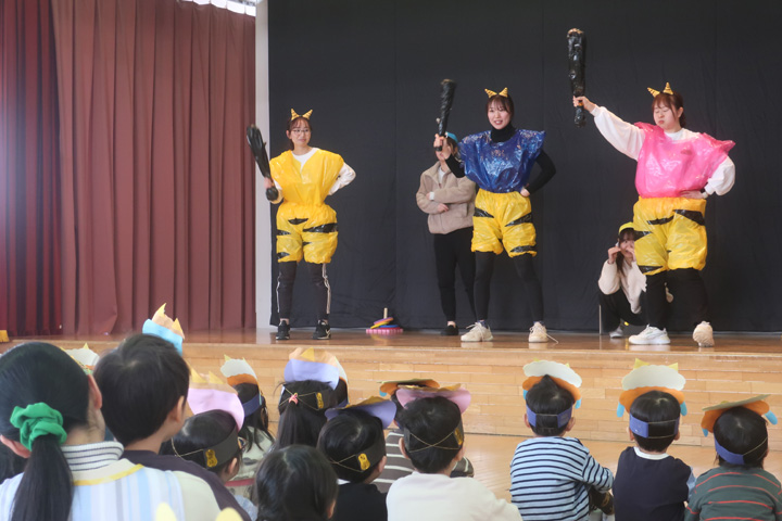 ちょっぴりドキドキしながら節分の準備を進めてきたみんな。 おにのお面をかぶってホールに集合し、先生方の劇を見ました!