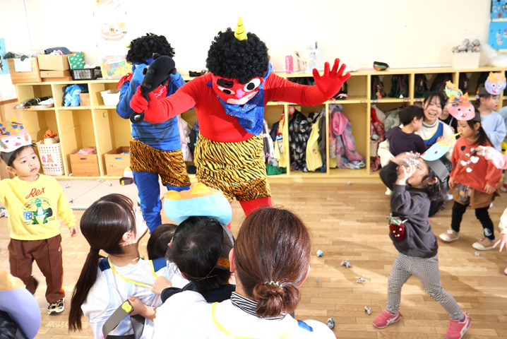 お部屋に戻ってしばらくすると、鬼さんがお部屋に! びっくりして涙が出るお友達もいましたが、みんなで「鬼は外!福は内!」とがんばりました!