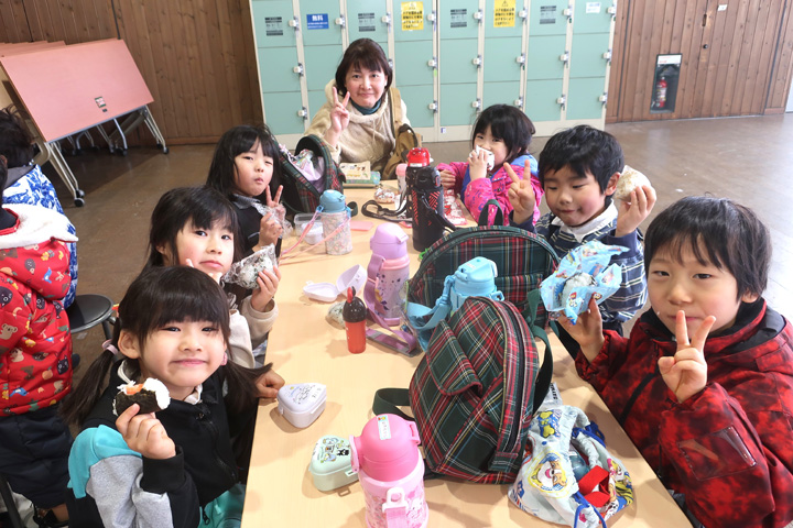 お昼は、お家の人が作ってくれたおにぎりです! とってもおいしくてうれしくて笑顔いっぱい☆ 最後の園外保育、楽しい思い出になりました。