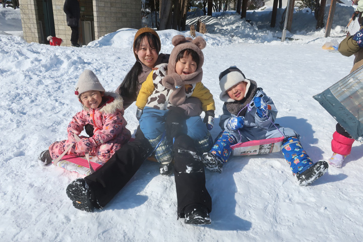 近くの吉田川公園で、そり滑りを楽しみました。 園の坂よりも大きいのでみんなで一緒に滑れます!