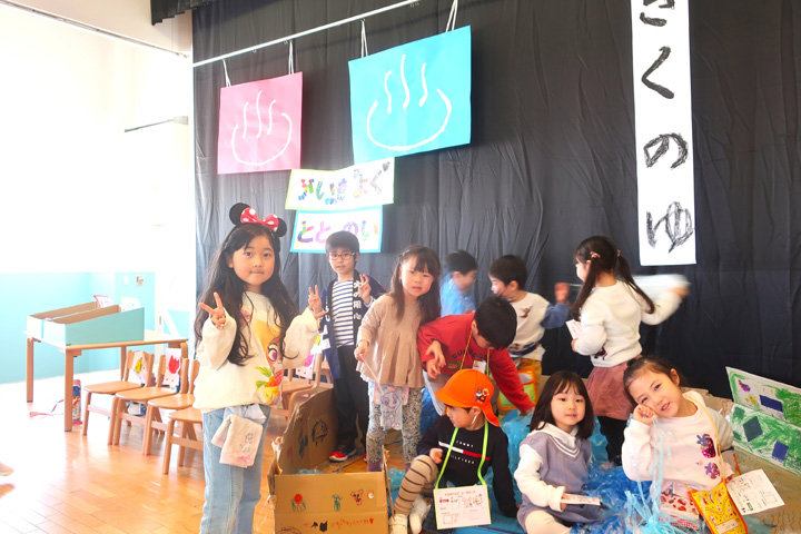 年長さんが楽しいお店をひらいてくれました! ひまわり組の射的では、小さい組さんに目線を合わせながら優しく声を掛ける素敵な姿が✨