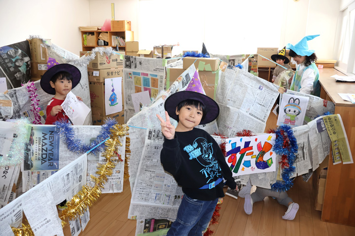 ゆり組さんはお部屋いっぱいに新聞をつるして迷路を作りました!チェックポイントではクイズも出ます☆ 「正解です!」と盛り上げる大きな声が聞こえました。