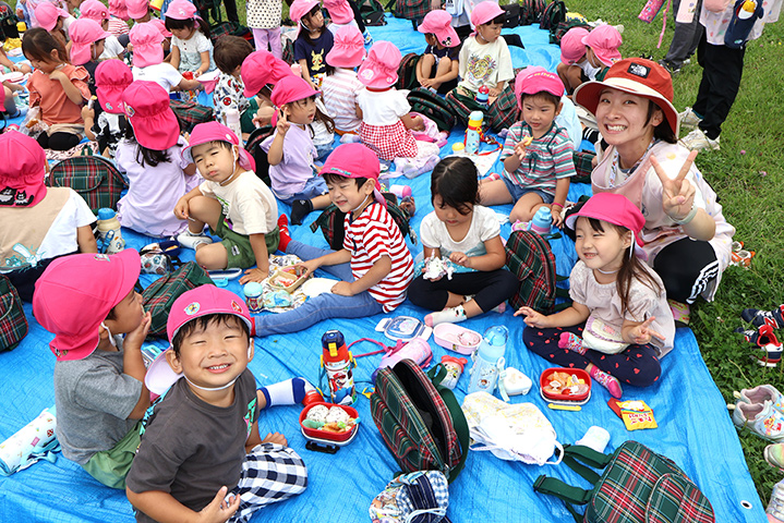 入園してから初めてお外でみんなでお弁当を食べるお友達もいました♪ ニコニコ笑顔でおにぎりを頬張っていましたよ🍙